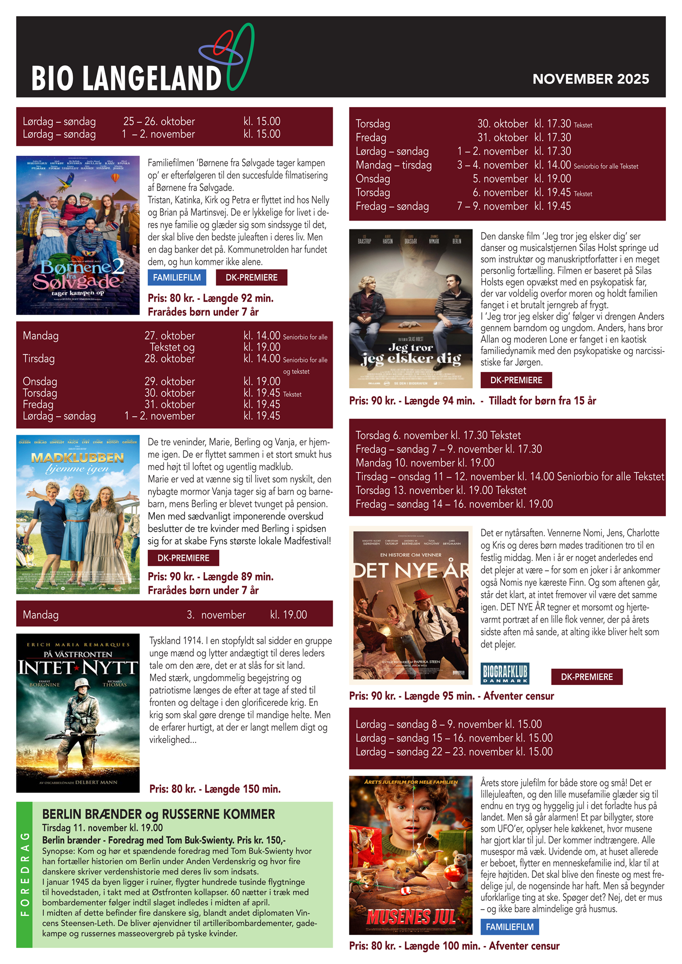BIO LANGELAND UDGIVER EN MÅNEDLIG FLYER. I denne KAN DU FINDER en OVERSIGT over FILM BIOGRAFEN VISER I DEN KOMMENDE MÅNED SAMT INFORMATIONER OM FOREDRAG OG KURLTURARRANGEMENTER.